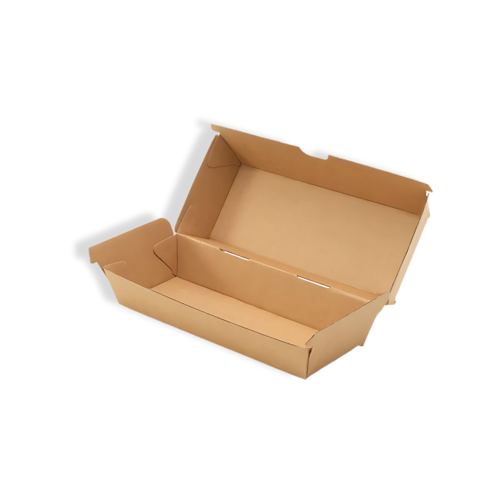 Mit dieser Papp-Hotdog-Box im Format 180 × 70 × 70 mm kannst du deine Hotdogs, Sandwiches oder Wraps hygienisch und stilvoll präsentieren. Durch den cleveren Klappdeckel bleibt alles frisch und ist leicht zu greifen – ideal für unterwegs und To-Go-Konzepte.